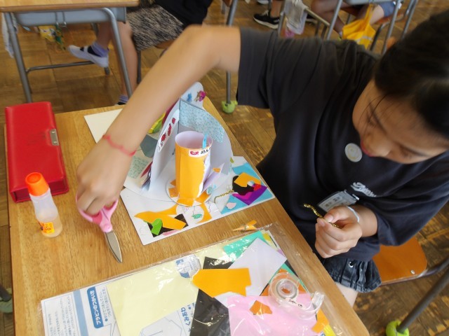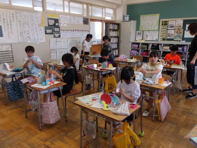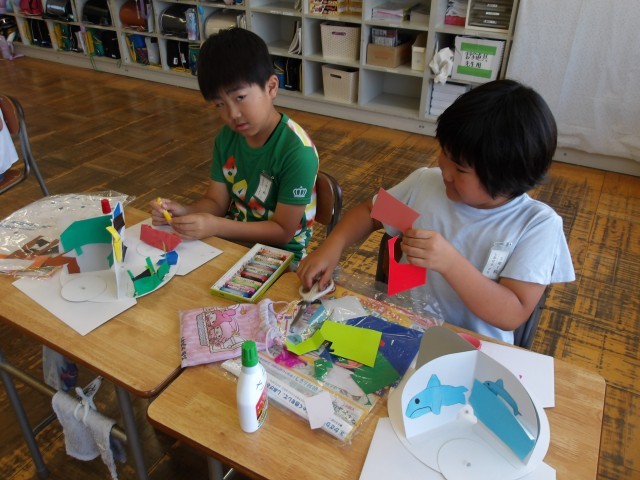 【わりピンワールド】という作品を作っています。わりピンをさして、くるくる回るようにしてあるようです。場面や場所、季節などに分け、回すことによっていろいろな世界が見えるようになっています。どの子もとても楽しそうに取り組んでいました。