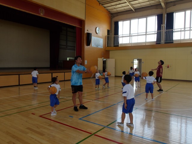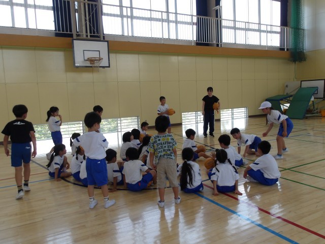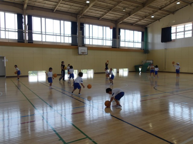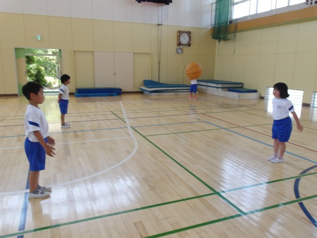 【ボール遊び】をしています。大きなボールを投げたり、転がしたり、1人でやったり、2人組でやったりしました。ボールが大きくて思ったよりも難しかったようですが、汗をかきながら一生懸命取り組んでいました。