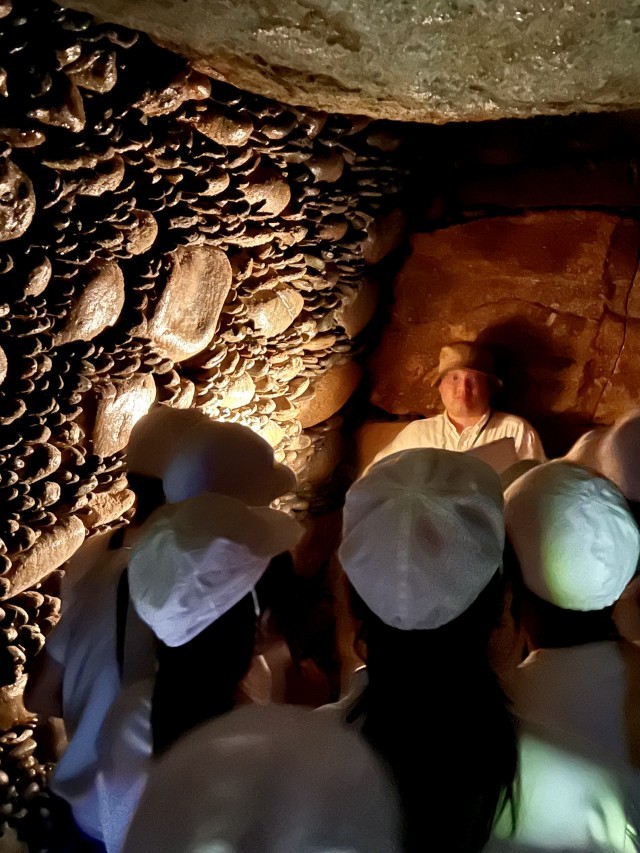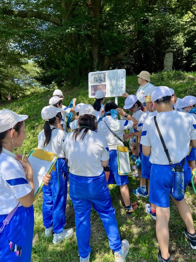 真夏を思わせる晴天のもと、6年生は藤岡市の古墳見学に行きました。まず、伊勢塚古墳の見学を行いました。藤岡歴史館の職員さんの解説で石棺の様子を詳しく説明していただきました。次に七輿山古墳を見学し、藤岡歴史館の見学を行いました。その後、3つの班に分かれ、事前に提示されたミッション遂行に向け、修学旅行の事前学習を兼ねた班別行動を行いました。ミッション終了後は、おいしくお弁当を食べました。