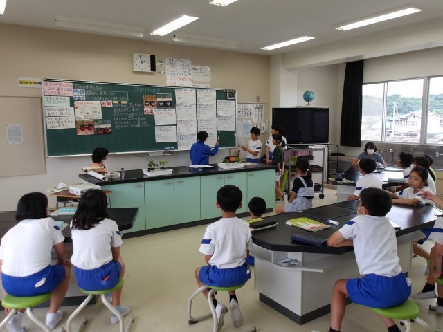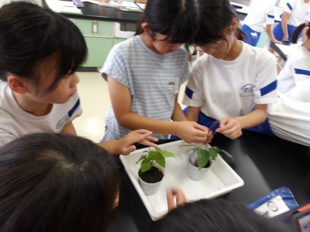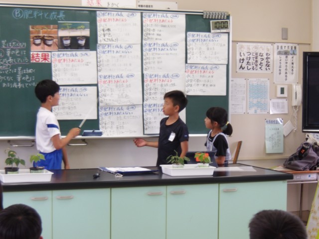 インゲン豆の成長の様子を観察しています。今日は【肥料がある】【肥料がない】ものを比べて、観察した結果を班ごとに発表しました。どんな考察になるのでしょうか?