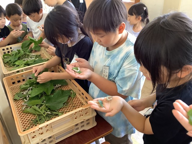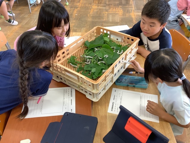 約1ヶ月間、3年生は全員でカイコの世話をしてきました。毎日校庭の桑の葉をとってきて、あげていました。とても小さな卵から、小さな幼虫になり、日々大きくなっていく様子を観察しました。今日は元気に育ってきたカイコが全部まゆになり、うれしいようなさみしいような感じです。3年生、本当によくお世話をすることができましたね。とってもえらかったですよ。