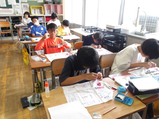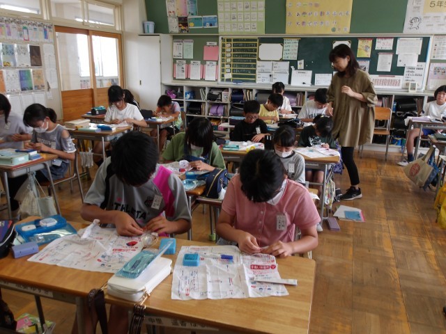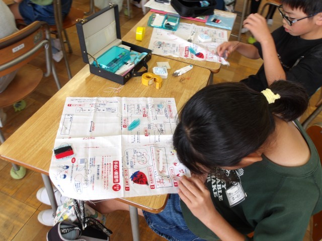 ボタン付けの実習です。針とボタンをじっと見て、布につけています。初めてする子も多く悪戦苦闘です。でも最後にはほとんどの子ができたようです。
