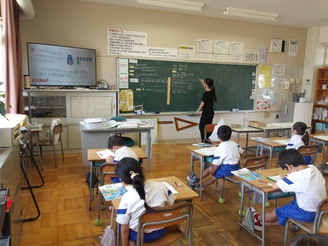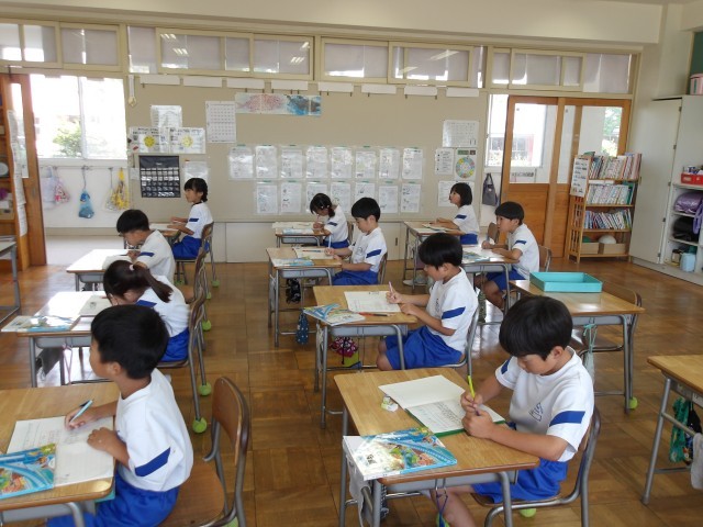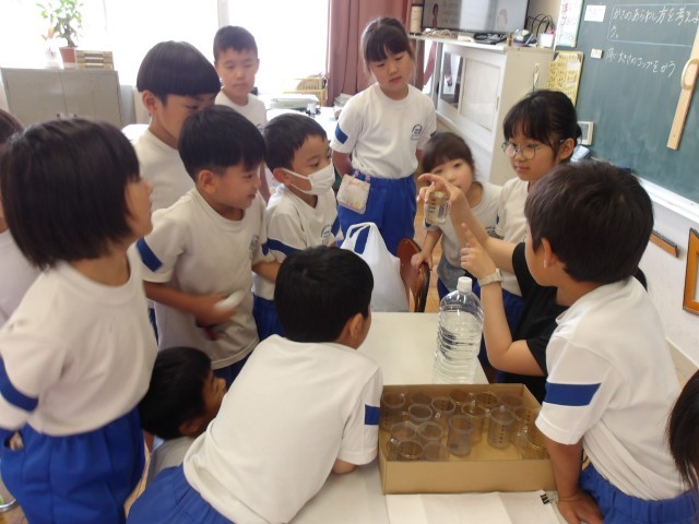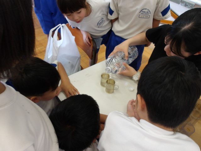 【かさ】の学習をしています。今日はデシリットル「dl」の練習から始まりました。それから実際に1dlがどのくらいの量なのか、目で見て確認していました。