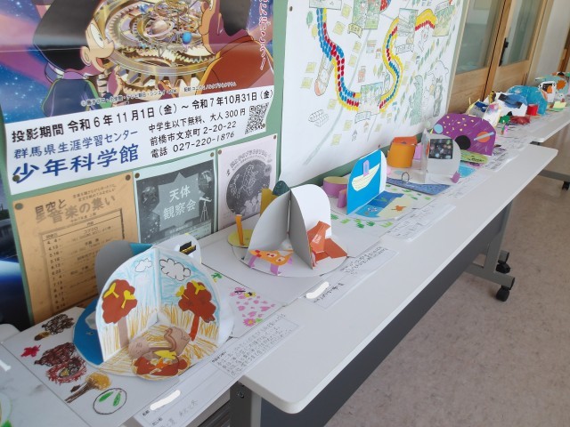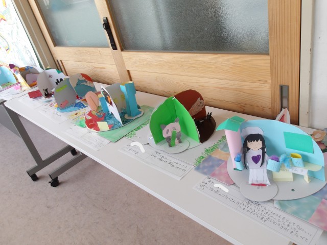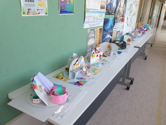 2階の廊下にかわいらしい図工作品が並んでいます。3年生が想像力を駆使した自分の世界がそこにあります。折り紙やモール、綿などさまざまな材料を使って、くるくる回るいろんな世界を作り上げました。