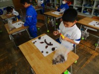 【あきさがし】で庭や公園、校庭で探してきたものを画用紙の上に並べています。大きな...