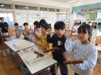 リズムの学習です。先生のタンバリンのリズムに合わせて、トライアングルや鈴を上手に...