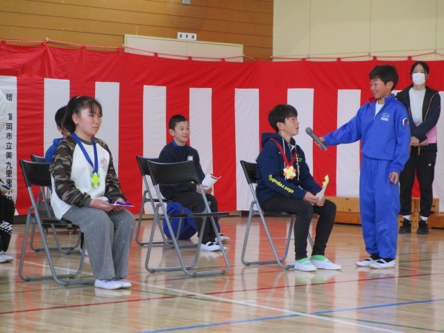 最初は3年生からメダルを贈りました。かわいい手作りのメダルが6年生にかけられ、少...