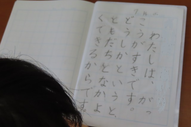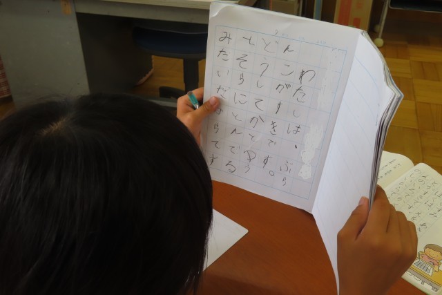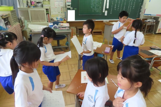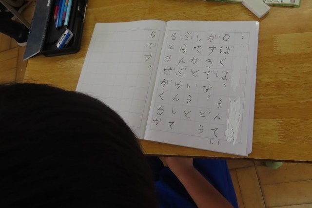 「すきな こと、なあに」の学習では、自分の好きなことについてその「わけ」と一緒に友達に伝えたり書いたりすることができるようになります。教室ではちょうど友達に伝えているところでした。1年生が口にする「すきなこと」は学校のこと、友達と一緒に遊ぶものなど、その楽しそうな光景が目に浮かぶものばかりです。そして友達のほうをよく見て聴こうとしている姿にも感激しました。友達のことを大切にして学習を進めることができる1年生です。