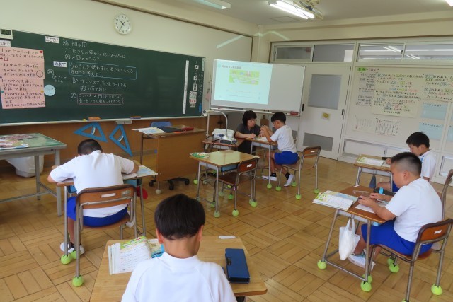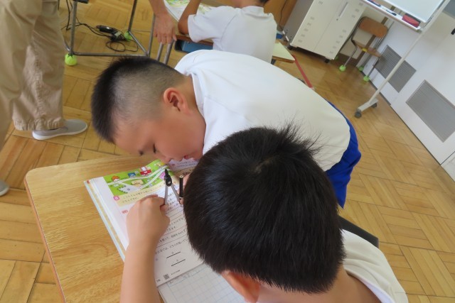 「円と球」の学習です。「ここでは」コンパスを使って円をかけるようになるだけではなく、「長さを写し取ることもできる!」なんて便利なんだ!と気付くことができました。今日の問題(家からスーパーまでの2本の道のりで近い方を選ぶ)を考えるにあたって、「これまで」ものさしを使ってはかっていましたが、今日はコンパスを使って道の長さを直線上に写し取ってみるとできた!ますますコンパスの上手な付き合い方が身に付いてきています。