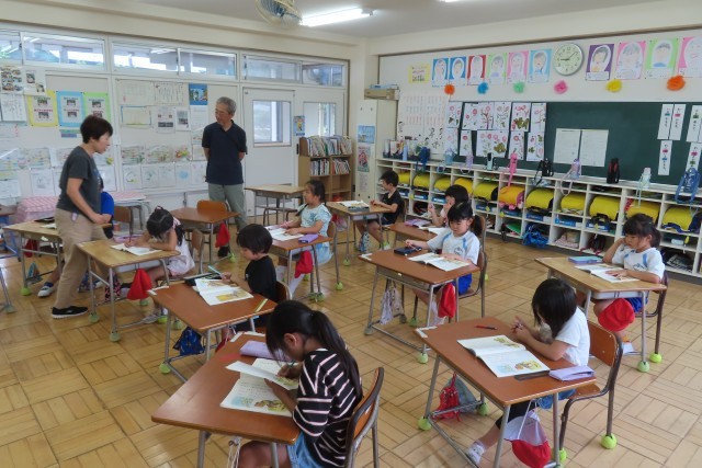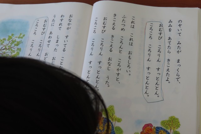 「おむすびころりん」の学習に入っています。教室では楽しそうに読んでいました。ほぼ全員の児童は、この話によく似た話が書かれた本を読んだことがあるそうです。その話は少し残念な展開だったようで、「ここでは」笑顔で読めるお話との出会いに、安心、嬉しそうでした。このお話で何度も出てくる「おむすび ころりん すっとんとん ころころ ころりん すっとんとん」をとても気に入ってしまいました。