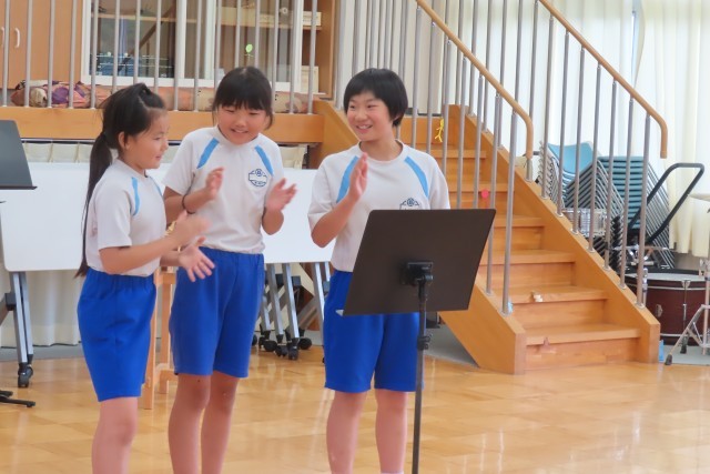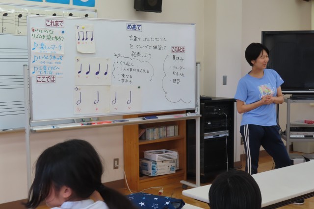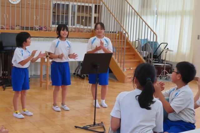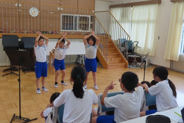 「言葉でリズムアンサンブル」今日は友達とテーマを決めていろいろなリズムで音楽作りをしていました。そのテーマを表現できるように、呼びかけあったり重ねたり、繰り返したり等の工夫を考えて表現しました。拍にのって表現し、みんなで発表しあいました。いろいろなリズムを組み合わせたり、特徴を感じ取ったりして、ますます音楽(作り)が大好きになる4年生です。