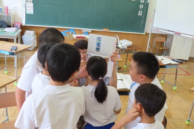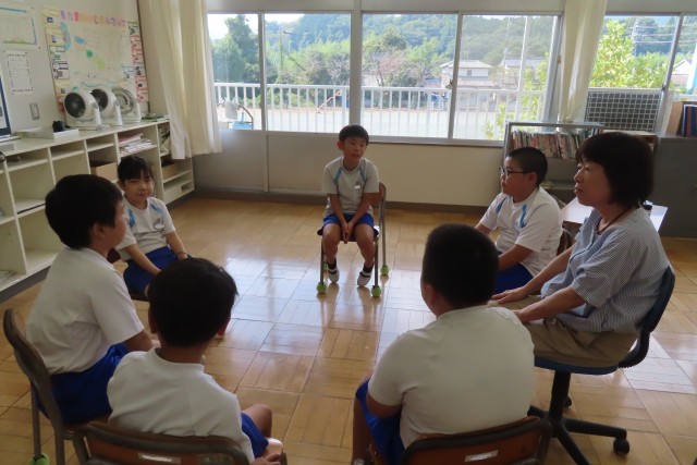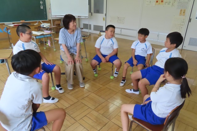 みんなで輪になって夏休みの楽しかった思い出を話していました。もっと聞きたいことを質問したり、絵日記を見合ったりして、思い出話に花が咲いていました。とっても和やかな雰囲気で、みんなで楽しくおしゃべりしているときの一人一人の優しい笑顔に、心が温かくなりました。
