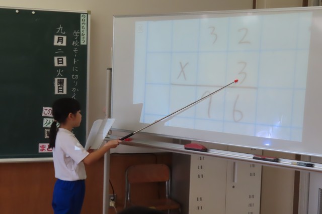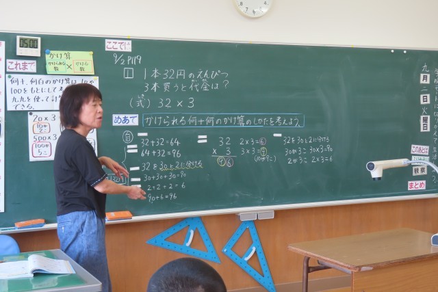 今日は、かけられる数が何十何のかけ算の仕方をどうしたらいいか?考えていました。3年生は、学習を重ねる度に、自分の考えはもちろんですが、6人6通りの考えから学ぶことが上手にできるようになっています。友達の考えを聴くだけではなく、友達の考えからさらに学ぶことができるようになっています。「言い方はちがうけど、考え方は同じだね」「ちょっとちがう考え方だね」など。どんどん力をつけていきますね。