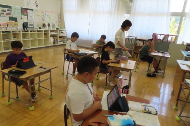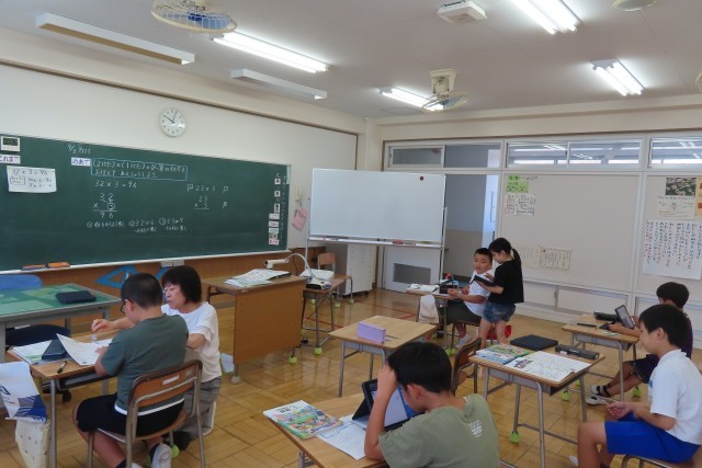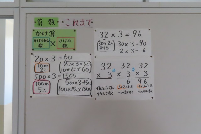 今日は、2けた×1けたのかけ算の筆算がバッチリできるようになるための時間でした。いくつかの課題を順番にこなしていきます。自分のペースでやって、分からないところはそのままにせず、自分で考えたり、先生や友達に教えてもらったりして「できた!わかった!」にならないと進めません。途中で止まってしまう問題もありますが、みんなあきらめずに頑張っていたので、感心しました。