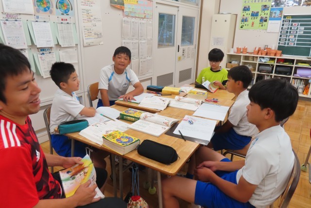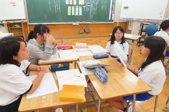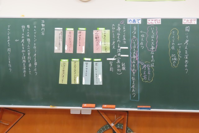 「いちばん大事なものは」の学習です。「ここでは」対話を通して、自分の考えを広げたり深めたりすること、いろいろな人の考えを理解することについて学びます。教室では、自分が日頃の生活の中で大事にしていることについて友達と伝え合っていました。また、聞いている友達からさらに質問されることで対話を通して、さらに自分の考えを整理することができていたようです。やはりこうやって目と目を合わせて言葉で対話することって大切です。それを十分に感じ取ってほしいです。