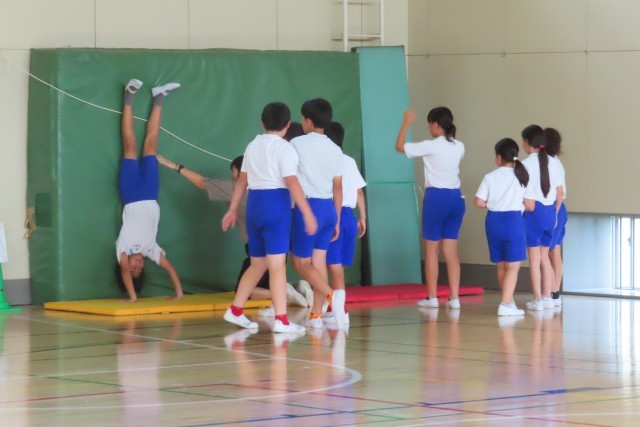 マット運動です。最初にみんなで共通の準備運動をしたあとは各自で自分の目標の技の上達に向けて練習は始まります。一人一人が自分の今日のめあての達成に向けて、努力しますが、どんな練習をしたらよいか?よく考えて練習しています。ロイター板をはさんでやってみたらどうか?友達に補助してもらいたい!タブレットで動画を撮影して見返してみようか!など。自分はもちろんですが、友達も一緒に考えながら練習しています。