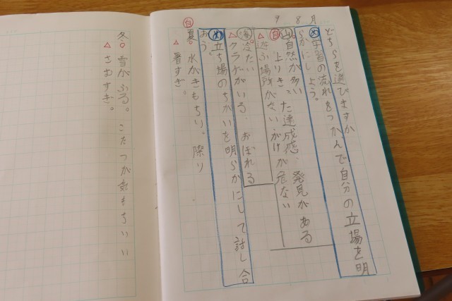 「どちらを選びますか」の学習に入りました。「ここでは」自分の立場や意図を明確にした対話を通して、お互いの考えを明確にしたり、よいところや問題等を比べたりするなど、説得力のある伝え方について学びます。テーマは夏か冬かどちらが好きな季節か?のようです。まずは自分の考えをノートにまとめ、ここからグループになってそれぞれの考えを伝えるための話合いを行うようです。