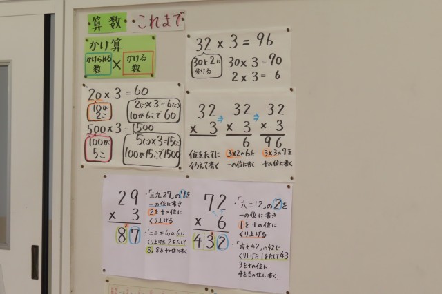 「かけ算の筆算」の学習では、くり上がりがあるかけ算の筆算がバッチリ、スラスラとできるようになりました。ちょうど教室ではどんどん振り返り問題にチャレンジ中。課題の計算が終わったら、さらに別のページの問題、計算ドリル、タブレット上のドリルと、どんどん自分のペースで進めていますが、のんびりしている児童は一人もいません。どんどん進めたくて真剣に頑張っていました。2年生のときに身に付けたかけ算九九がしっかり定着できているので順調です。
