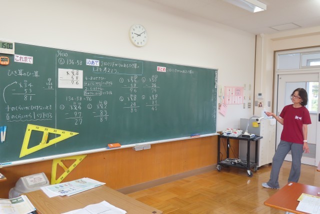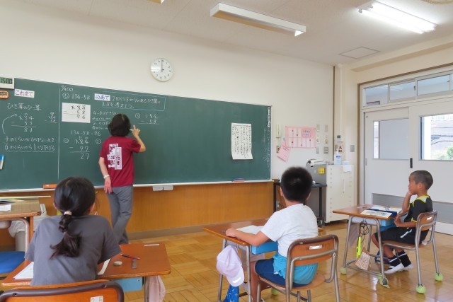 「くり下がりのあるひっ算、たのしい!」3人とも、早く次の問題がやりたくてやりたくて仕方がない様子です。今日は2回くり下がりがある筆算です。昨日より1つくり下がりが増えましたが、昨日の学習がしっかり身に付いているので、よくできていました。さらに、3人ともしっかりと計算の仕方を言葉ではっきりと説明することができました。先生がとてもほめていました。「できた!」「たのしい!」が大きな自信につながっていることも表情からよく伝わりました。