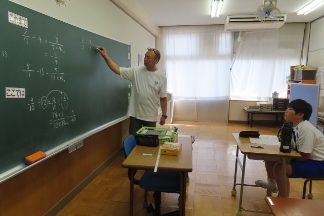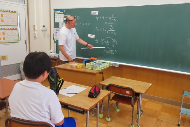 6年生が「分数のわり算」を学習中です。分数でわる計算では、わられる数にわる数の逆数をかけることがよく理解できていました。そして約分に気を付けて計算することもバッチリできていました。先生と一緒に丁寧に一つ一つ考えながらも、「やる気いっぱい」なので、どんどん自分の力で解くことができるようになっています。