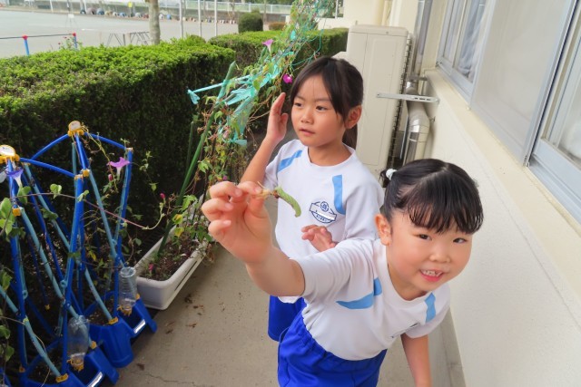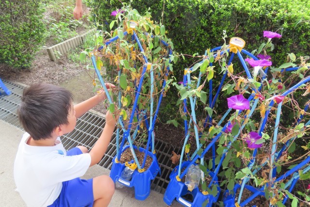 1年生の保護者の皆様には、児童の大切なあさがおを夏休み中に一緒に世話していただき、また持ってきていただき、ありがとうございます。おかげさまでまだまだ元気に花が咲いていて、登校すると皆、「また、さいたよ!」と大喜びです。そして2学期になって新しい日課が加わりました。今度は丁寧に種をとっています。「こんどくる1ねんせいに、あげるんだ!」「わたしたちも、2ねんせいから もらったもん!」心の素直な優しい1年生に朝から笑顔いっぱい!です。