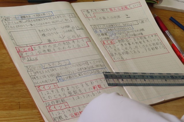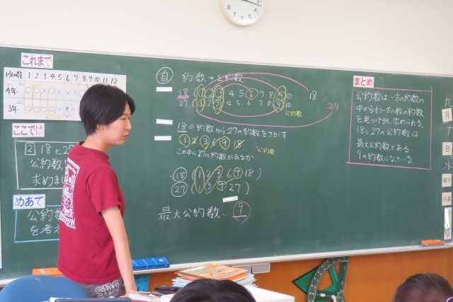 「整数の性質」の学習では、公約数の見付け方について考えていました。もちろん理解できますが、最大公約数と公約数の関係についてまとめてみようとすると、それを言葉で表現するのはなかなか難しいようで、少し困っていました。でもそこをあきらめないでなんとかできるようにしようと頑張れるところが5年生のいいところです。このあと振り返り問題を通して、「なるほど、そういうことだったのか」とスッキリできるとよいですね。