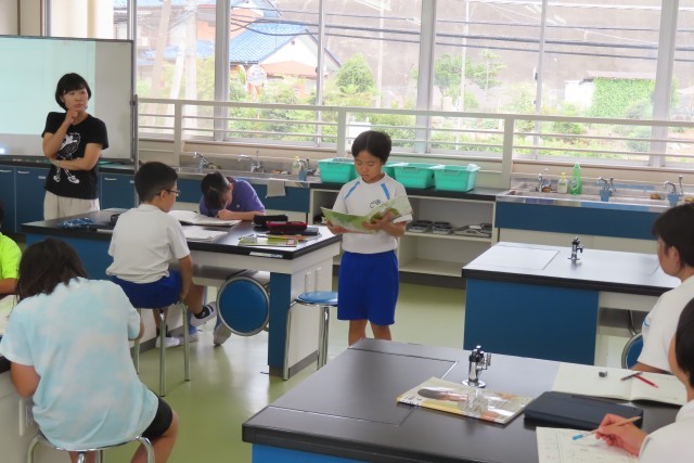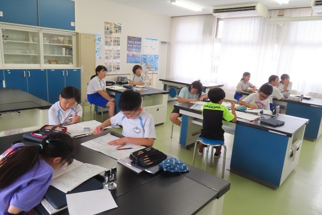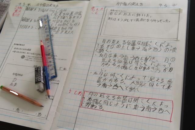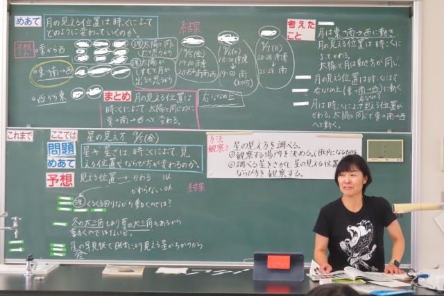 「月や星の見え方」の学習で、今日の問い「月の見える位置は時こくによってどのように変わっていくのか」です。ちょうど理科室では「まとめ」をしていました。分かったことを自分の言葉でまとめますが、皆、違っています。それぞれ全体で発表し合っていました。友達の発表をよく聴いて、自分で付け足してみるなどして学んでいる4年生の姿は、とても素晴らしい習慣になっています。