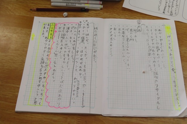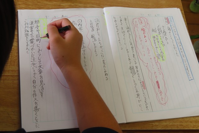 「どう直したらいいかな」の学習で、教室ではちょうど、今日の学習を振り返って自分の学んだことをまとめているところでした。「ここでは」年下の3年生にクラブを紹介する文章を例に、相手や目的に応じて文章を見直すことの重要性について考えました。見直すことの重要性です。自分の伝えたいことが伝わるように、相手の立場にたって考え直しをするという、思いやりにあふれた文章の書き方を考えます。