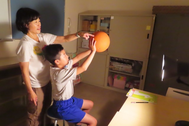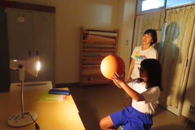 「月の形と太陽」の学習中です。今日は月の見え方について、ボールに光をあてる実験を通して考えました。電灯を太陽の光として、ボールを月と見立てて、ボールの位置を変えながら、月の位置や形と太陽の位置との関係について考えました。そしてこの実験の結果、そしてそこから分かることをしっかり考察することでここでの課題解決につなげます。あわせて、どんなふうに調べたらいいのかということも学んでいます。調べてみたいな!という疑問がわいたときに、こうして身近なものを使って調べることができるということも経験しています。