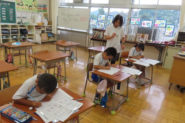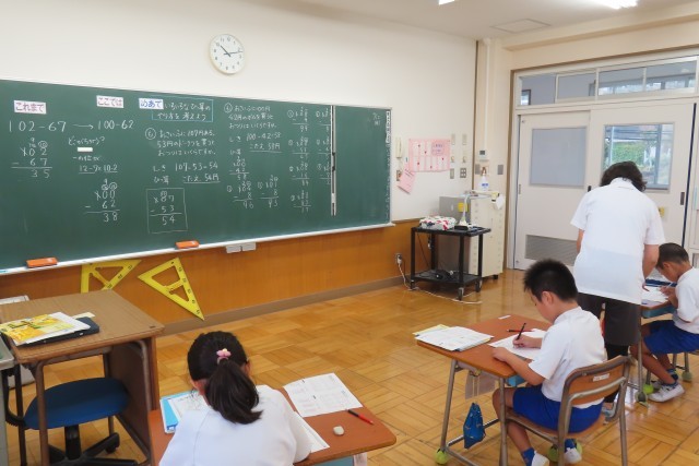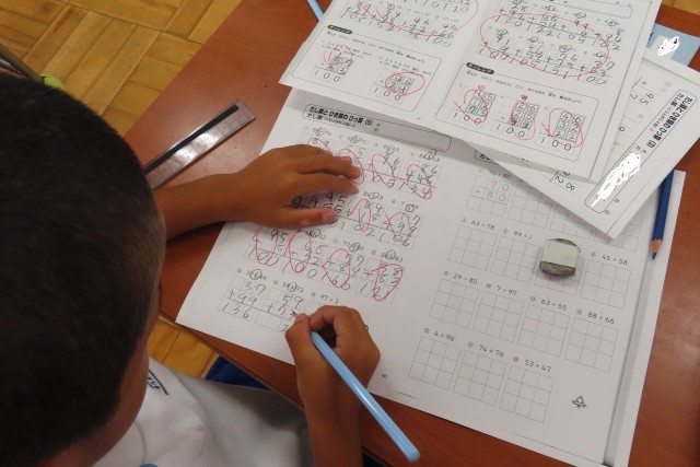 「たし算とひき算のひっ算」の学習です。どんどんできるようになっていて、教室ではたくさんの問題にどんどん!どんどん!チャレンジしていました。集中力100点満点で、さらにとてもよくできるので、先生はたくさんほめていました。そして児童のプリントに○つけをしていましたが、○ばかりでとても嬉しそうでした。でも一番うれしいのは、この頑張っている3人の2年生ですね!