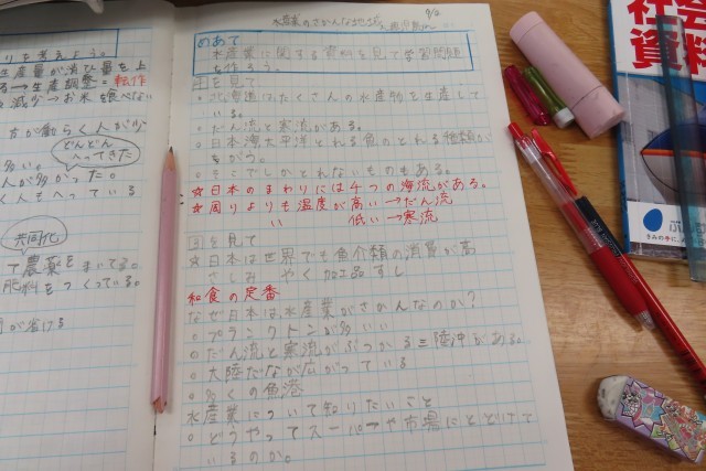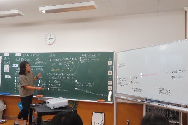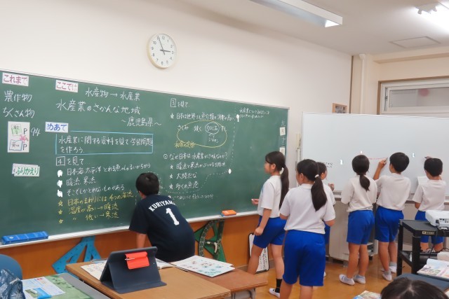 「水産業のさかんな地域」の学習に入り、今日は「ここでは」学習課題をつくりました。いくつかの資料を見て、調べてみたいこと、疑問に思ったことなど、それぞれが黒板に書き出しました。みんなの知りたいことがまとめられると、私もそれを調べたい!たしかにそこも知りたいな!次の授業が楽しみになってきます。今日の夕飯は魚が食べたくなったなあとつぶやく児童がいました・・・。