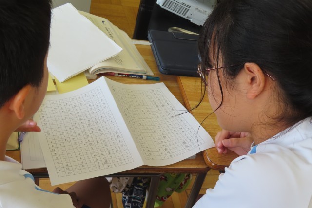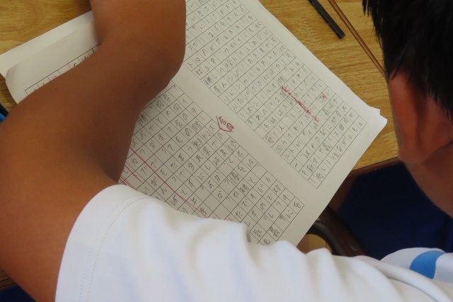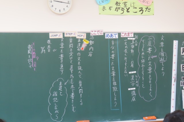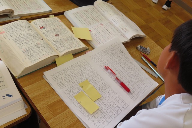 「文章を推敲しよう」今日は自分の書いた文章をお互いに読み合って、友達の文章に、どう直すとよいと思うか?自分の考えを書き入れていました。「ここでは」読む人の立場に立ってよりよい文章にすることの重要性も学びます。自分では気付かなかったことに気付かせてくれ学びが充実します。友達と一緒に学びあうことのよさですね。辞書を使ったり、付箋や赤鉛筆を使ったり、言葉で伝え合ったりして、よりよいものに仕上げていきます。