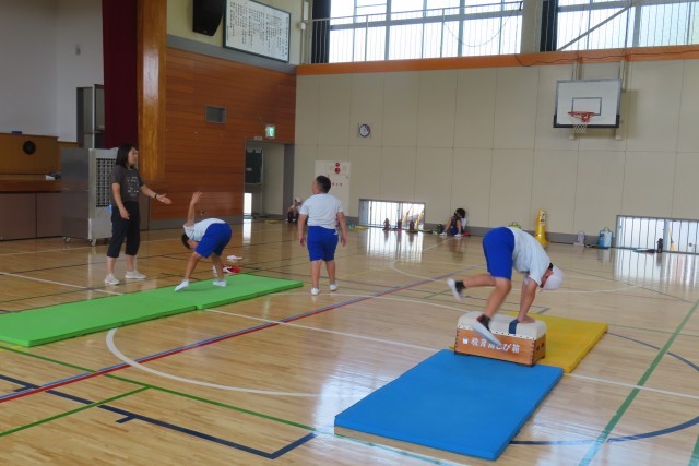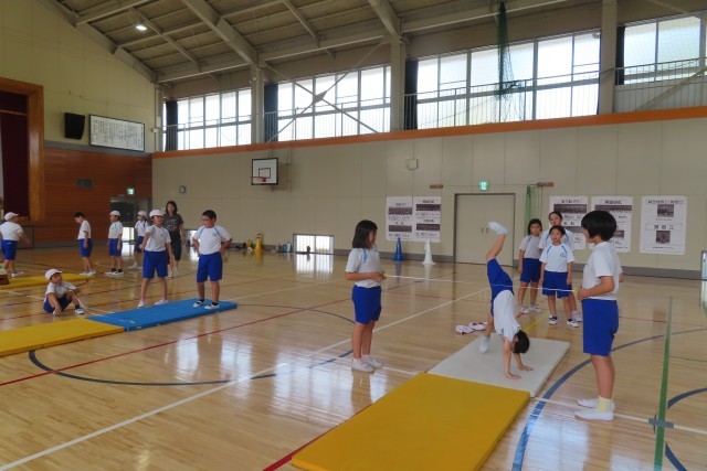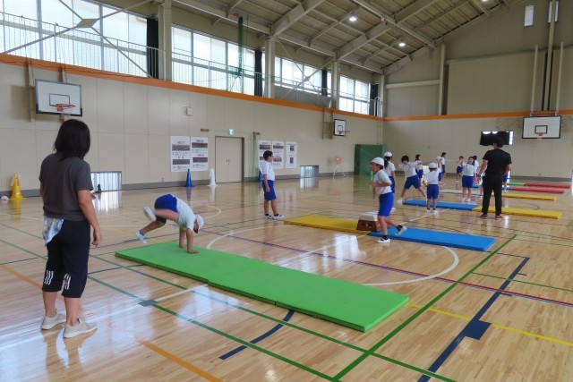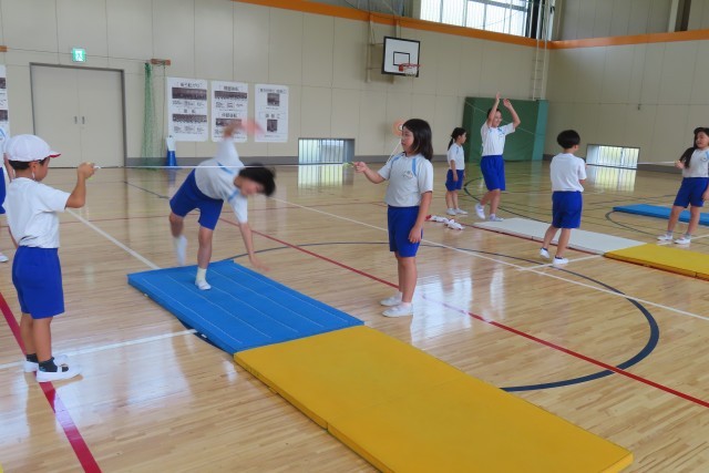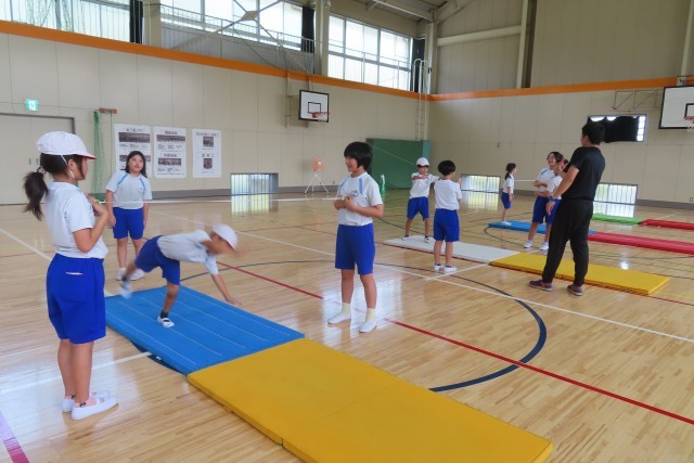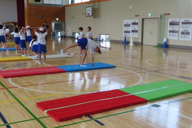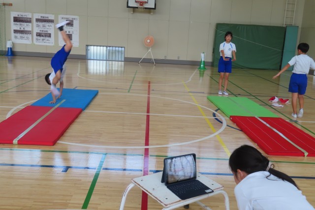 今日は、側方倒立回転(側転)ができるように、より美しくできるように挑戦しました。3つのコースに分かれ、補助台やゴムを使うなどして、どんどん練習していました。そのような道具の活用も上手ですが、やはり一番ためになるのは、友達の目、支え、言葉でした。自分のことのように友達の演技を見て、しっかりアドバイスすることができる児童たちです。だから「できた!」は自分だけでなく友達の上達も自分のことのように喜べます。すてきな学び合いができる児童たちです。