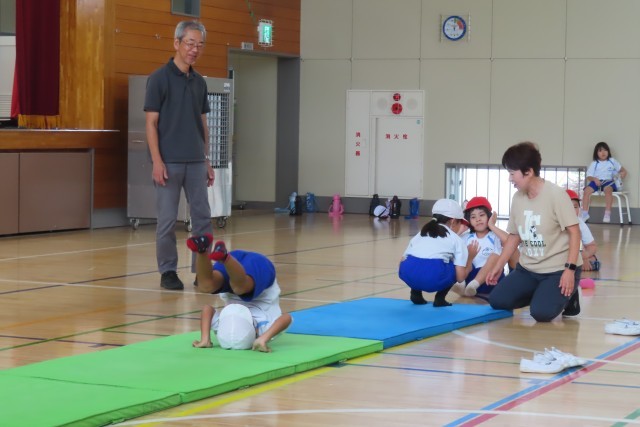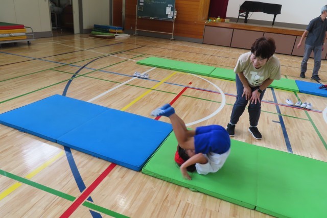 「マットうんどう」です。今日は、前転と後転にチャレンジ。感心したことがいくつかあります。それは挑戦する前に、しっかり先生の話をきいていることです。体育の学習の基本中の基本、安全に楽しく頑張れるようにするために、そういうときこそ集中しています。もう一つは、あきらめないで挑戦していること。そしてもう一つは、マットの横に脱いだ靴がきれいに揃っていたこと。だから落ち着いた雰囲気で安全に学習が進められるのだと思いました。