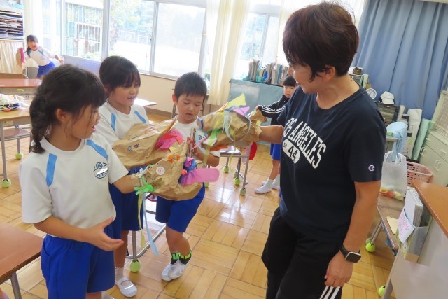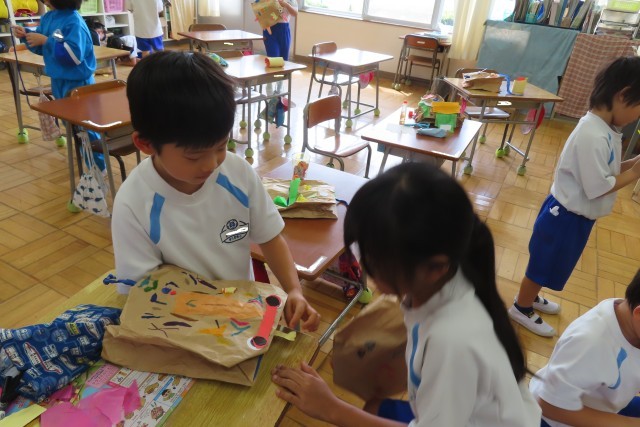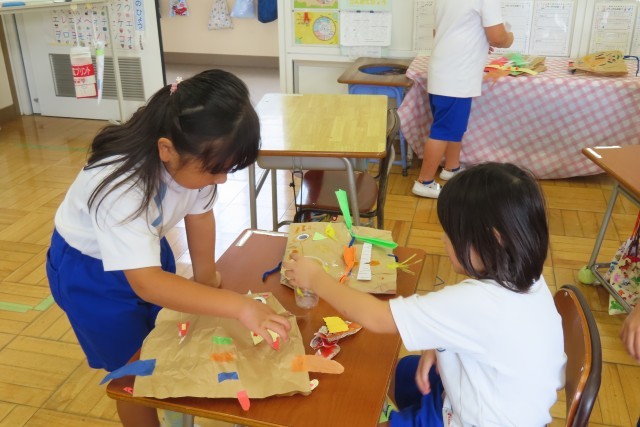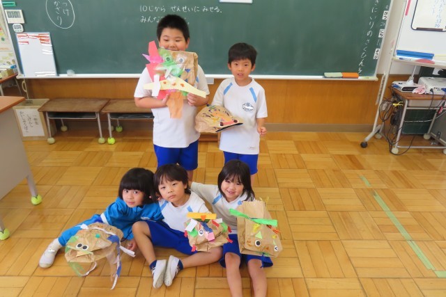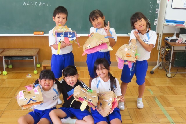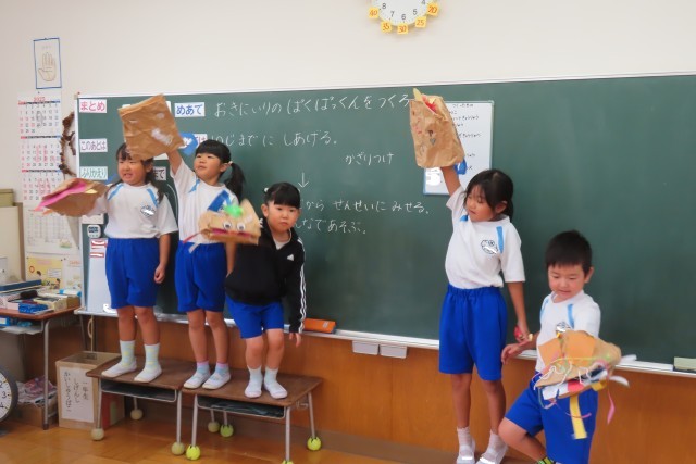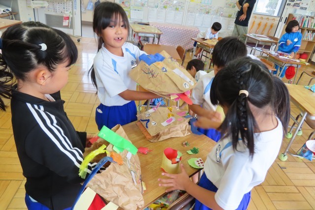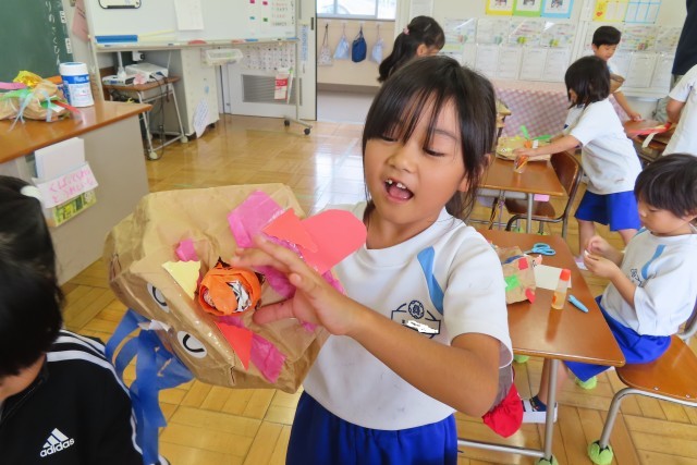 お気に入りの「ぱくぱっくん」で友達や先生と楽しそうに遊んでいました。ご飯をモグモグおいしそうに食べたり、空を飛んだり、お化粧したり、サングラスをけけてかっこよくキメたり。それぞれが大好きな「ぱくぱっくん」になるように工夫して出来上がりました。いろいろな工夫についてたくさん話をきかせてくれました。