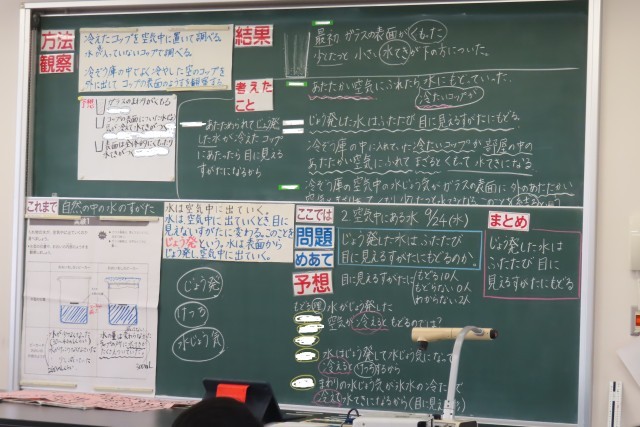 「自然のなかの水のすがた」の学習中です。今日の問いは、「じょう発した水は、ふたたび目に見えるすがたにもどるのか?」です。ちょうど理科室ではその「まとめ」をしていました。でも今ひとつ理解できない友達がいました。それを他の友達がしっかり自分の言葉で(伝え方を悩みながら)説明します。みんなが理解できるようになりました。「よく分からないから教えてほしい!」と言える子、そして「みんなが分かるまで」と考えるクラス、「どう説明したらいいか」とみんながさらに丁寧に考える姿に感心しました。