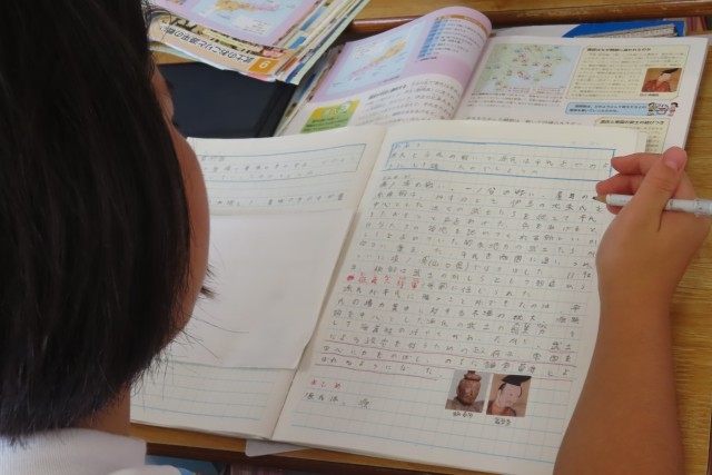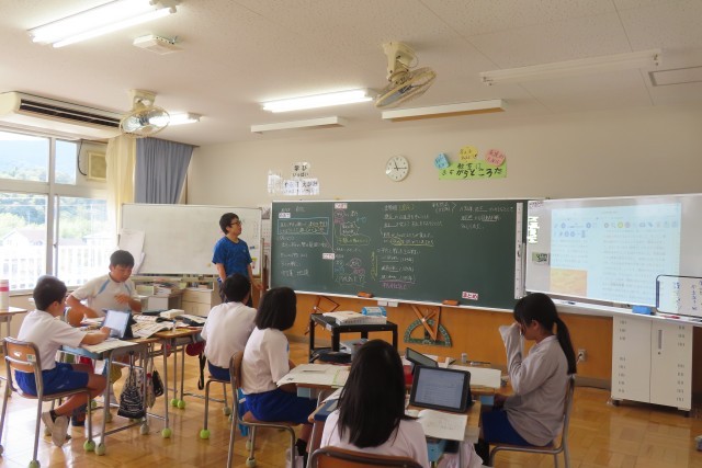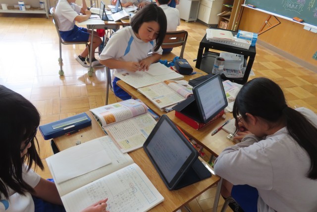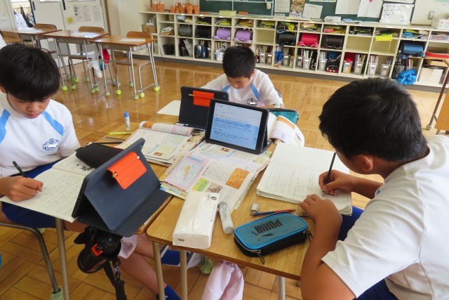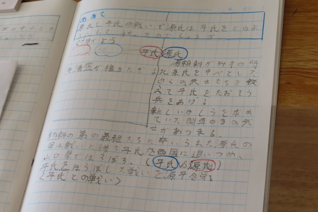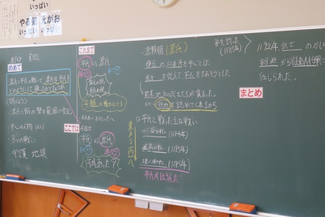 「武士の世の中へ」今日は、源平の戦いで、源氏が平氏をどのようにしてたおしたのか?考えました。「これまで」学習した保元の乱や平治の乱では、平氏が源氏をおさえて権力をにぎっていたのに、今回は「どうして?」が児童の「調べてみたい!」意欲を高めたようです。教科書、資料集、タブレット・・・調べたいものが机の上に広がっていて「そうだったのか」が出てきます。そしていよいよ「鎌倉幕府」の登場にとても嬉しそうでした。
