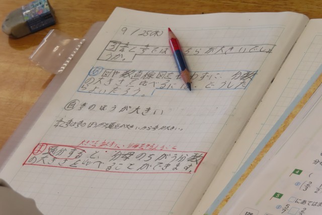 「分数のたし算とひき算」の学習です。今日は、分母の違う分数の大きさを比べる方法を考えていました。「これまで」は数直線や図を使って考えていましたが、「ここでは」通分するとできる!分かりました。もちろん、「これまで」整数の性質として身に付けた最小公倍数がきちんとマスターしていないといけません。さあ、今度は計算ができるようになるために、しっかり定着させて、自信をもってほしいです。