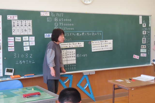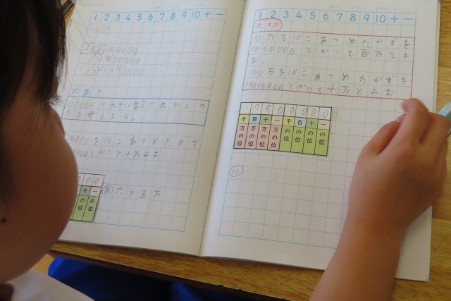 「10000より大きい数」の学習中です。今日は、10000より大きい数の表し方や読み方をさらに調べていました。10万、100万、1000万と位表を使いながら学習していきますが、3年生はすごいです。それよりも大きな位をよく知っていてどんどん言えます。友達が言ってみると、他の児童は、自分も知りたくなってしまう3年生。こうやってますます数字に関心が高くなり、算数が大好きになっていきますね!