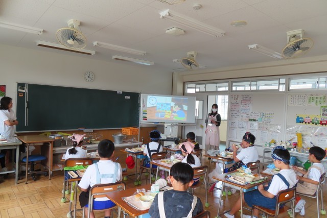 藤岡市給食センターでは年間を通して、栄養士さんが各教室を訪問して「食べること」の大切さなどを児童に直接分かりやすく伝えてくれます。今日は2・3年生の教室で、「はやね・はやおき・あさごはん」の大切さを話してくださいました。児童はおいしい給食を味わいながら、よく話を聞いており、栄養士さんはとても感心して帰っていきました。また、栄養士さんは、児童から「給食おいしいよ」との言葉が伝えられて、みんな残さずおいしそうに食べている様子を見て、喜んでいました。