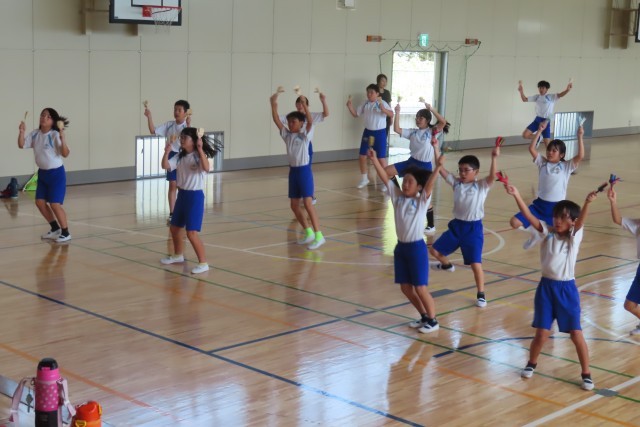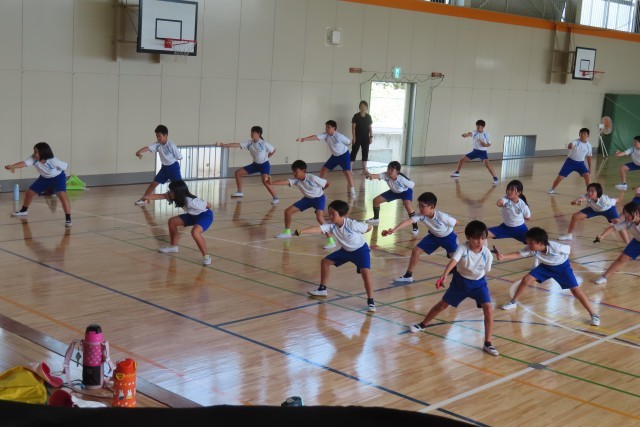 運動会では「雷光」を表現します。練習が始まったばかりですが、「やる気いっぱい」真剣です。覚えたての動きを、腰を低くして、体いっぱい表現しています。頑張れば頑張るほど、さらにレベル高く、美しくかっこよく表現できるようになりたい!と思いが強くなります。