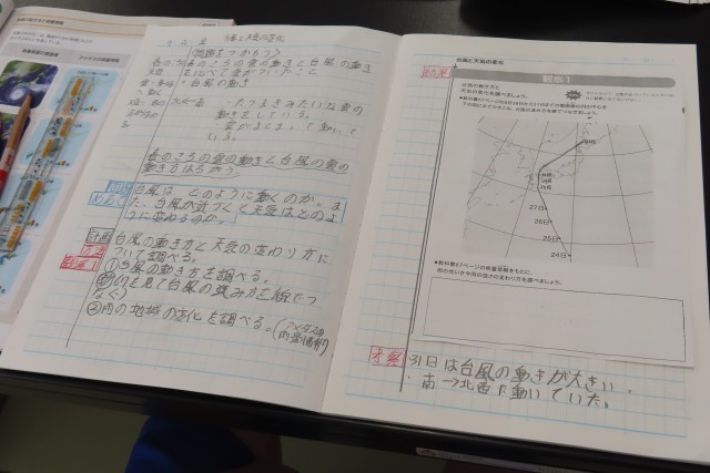 「台風と天気の変化」の学習に入りました。今日は、教科書の台風に関する写真資料を見て、台風の動き方と天気の変化について調べてみて、その結果から分かることを考察していました。「ここでは」天気の変化について、様々な気象に関する情報とつなげて予想することができるようになります。さらに、台風等による災害にもつなげて考えて、自分の生活、みんなの生活が安心、安全であるためにできることを考えられるようになります。