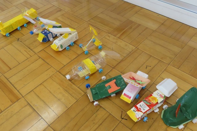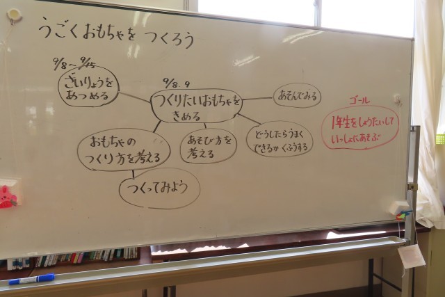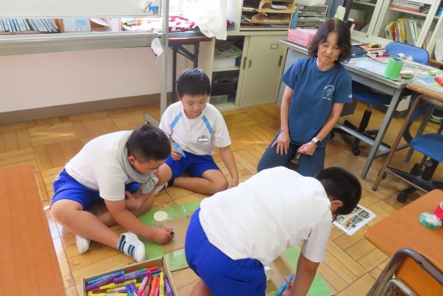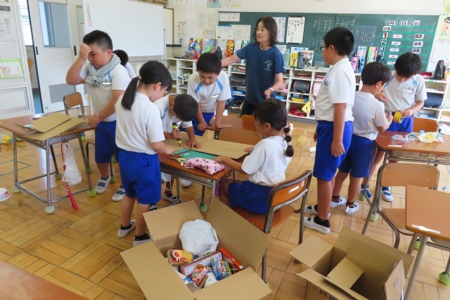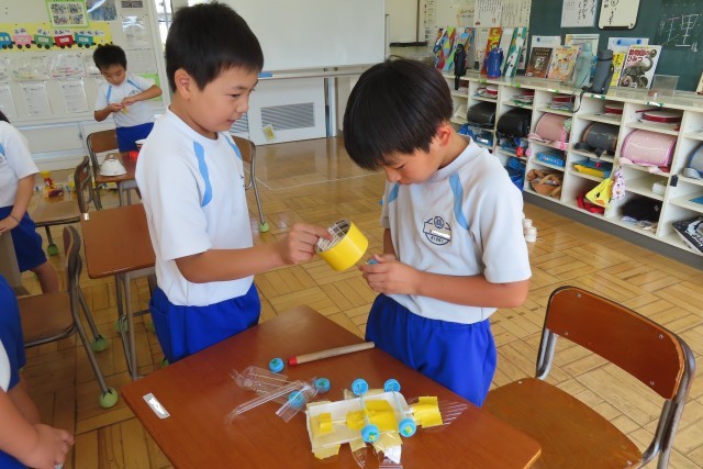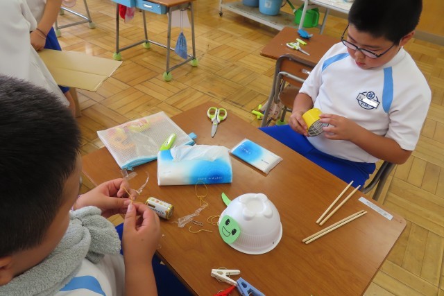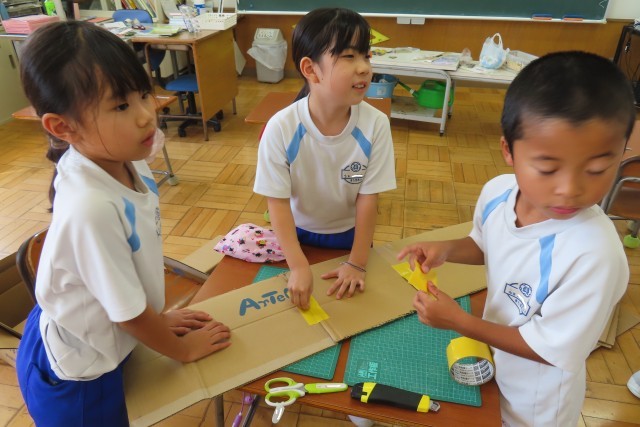 2年生は生活科で、「動くおもちゃランド」をつくって、1年生と一緒に遊ぶ計画をしています。身の回りにあるいろいろなものを再利用するなどして、もっと楽しく!もっと速く!もっと動く!そのために工夫を凝らして作っています。今日は、3年生が一緒に加わって手伝ってくれました。いつも一緒に複式学級で生活している大事なお友達の作品づくりに協力する強力な!助っ人です。道具の使い方やアイデアなど、頼もしい3年生の活躍が見られました。