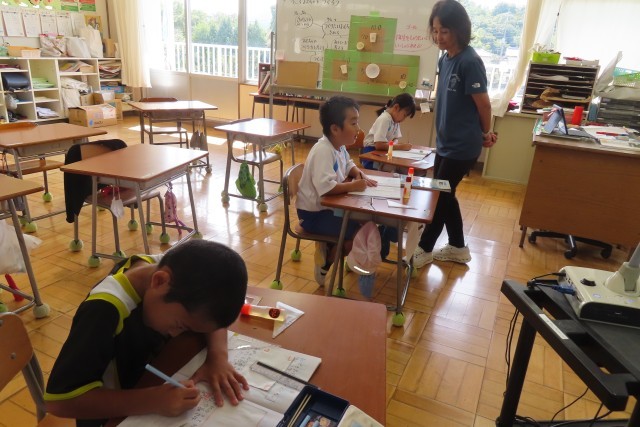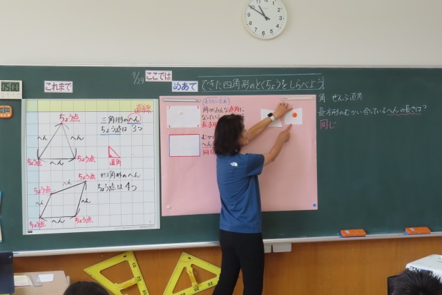 「三角形と四角形」教室ではちょうど、いろいろな形の四角形の見て、それは長方形かな?長方形ってどんな形だったかな?一生懸命考えました。かどが直角になっているのはどうやって調べればいいのかな?「ここでは」初めて手にした三角定規を上手に使って調べることができるようになっています。そして様々な図形の見方・考え方をきちんと言葉で説明できるようになっています。、