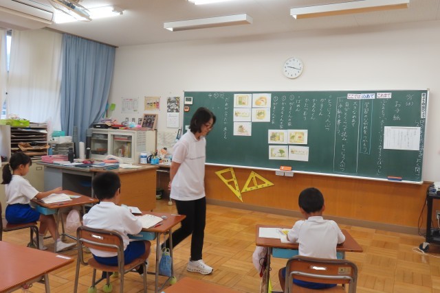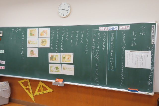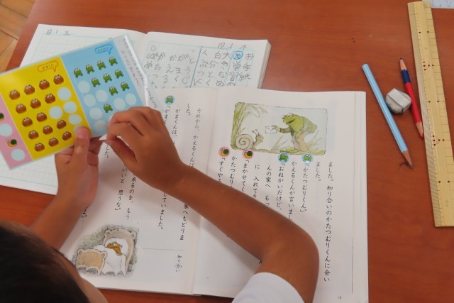 新しい教科書(下)は「お手紙」から始まります。今日は「ここでは」どんな学習を進めるのか確認し、教室では、だれが、なにを言っているのか?がまくん、かえるくん、かたつむりくんそれぞれの言葉を確認しながら、かわいいシールを貼っていました。「ここでは」このお話を自分と比べて考えながら読んでいくようです。なんてワクワクする問いなのでしょう!