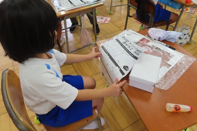 「たいせつボックス」を作り始めました。1年生に聞いてみると、自分にとって「たからばこ」が出来上がるようです。今日は箱を形にするのに一苦労していましたが、「こんな たからばこを つくりたいな」という願いがいっぱいなので、のりやセロテープと格闘しながら箱作りを頑張っていました。そして感心しました(写真下)。作り方の説明書を見ている児童がいました。もちろん先生に教えてもらいますが、説明書を見ながらつくれるようになりたい気持ちがあるそうです。