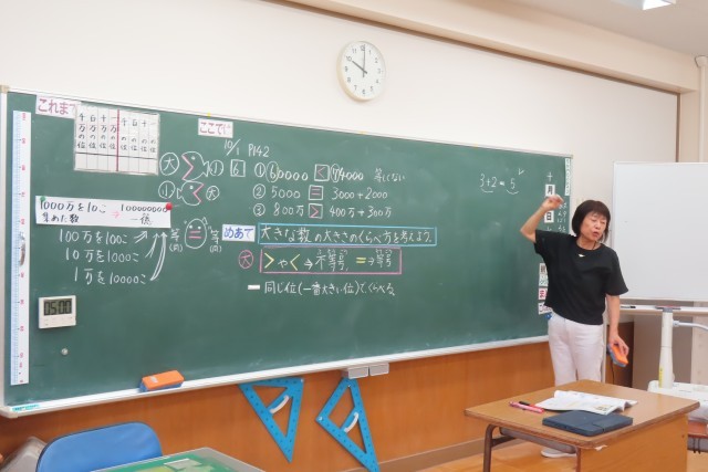 「10000より大きい数」の学習中。今日は、等号や不等号、「等しい」という言葉を知りました。「1年生のときから ずっと使っていた=は 等しいということだったのか!」「2+3=5、2+3は5と等しいという意味で=だったのか!」新しいことを発見したり、「へえ、そうだったのか!」と知ったりすることは、児童にとって、すごく嬉しいことです。これからもずっと、そんな学習の楽しさをたくさん味わってもらいたいものです。