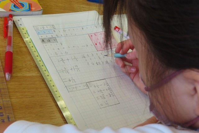 「分数のたし算とひき算」の学習では、分母も分子も違う分数の計算など、いろいろな計算の仕方については、5年生にとってはなかなか難しさを感じているようです。でもそこであきらめず「できるようになりたい!」気持ちから真剣に頑張れるところが5年生のいいところです。誰かにすぐ頼らずに、「正解にたどりつかないなあ」と言いながらも一生懸命考えている5年生の姿が見られました。