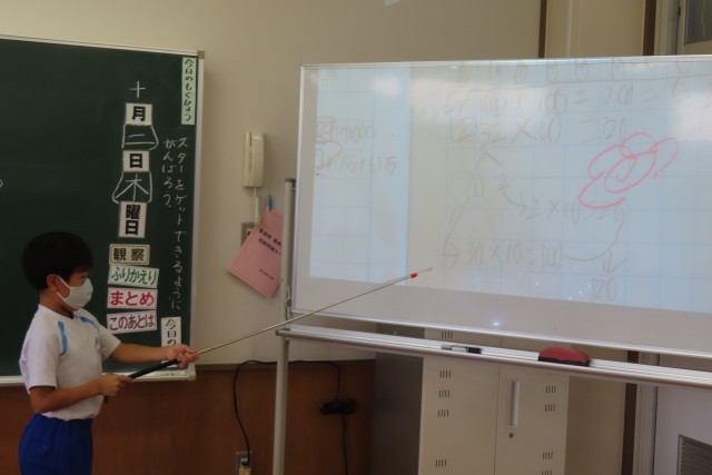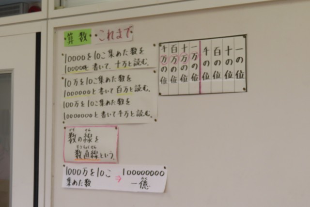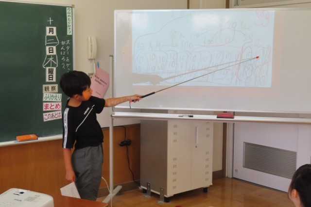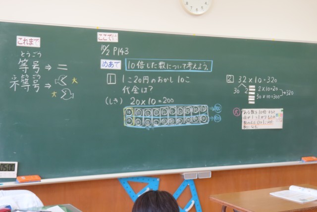 「10000より大きい数」の学習がとても順調に進んでいます。今日は、10倍した数について考えていました。今日の問題に対する自分の考えを全員が発表しました。みんな同じ考え方をしていますが、その表現の仕方は違います。それもしっかり理解できている3年生です。「図のかきかたは ○○さんとちがいますが、考え方は同じです」こういう発言ができる3年生の力はすごいです。頑張っています。