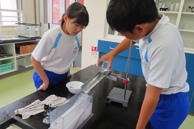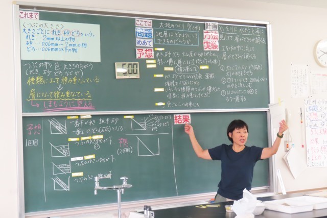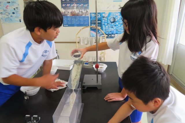 「大地のつくり」今日は流れる水の働きによる地層のでき方について、実験しました。といを川に見立て、水槽を海に見立てて、砂や泥を混ぜた土を丁寧に流して、そのつもり方はどうなるか?予想してから実験です。学びたいことを知るために、どんな実験をしたらよいか?どんなことに気を付けて調べたらよいのか?その計画の段階から頭を働かせて、大切な学習が始まります。